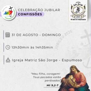A Missa acontece na Igreja Matriz São Jorge, às 15h. Neste mesmo domingo, acontecem as confissões, das 13h30 às 14h35. A comunidade é convidada a participar deste momento de Fé.