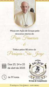 Na manhã desta terça-feira, 22, o padre Marcos Denardi informou à nossa reportagem que o tríduo em homenagem ao Padroeiro da Paróquia São Jorge de Espumoso também será momento de rezar pelo Papa Francisco, que morreu aos 88 anos por conta de um acidente vascular cerebral (AVC), seguido de um quadro de insuficiência cardíaca irreversível.