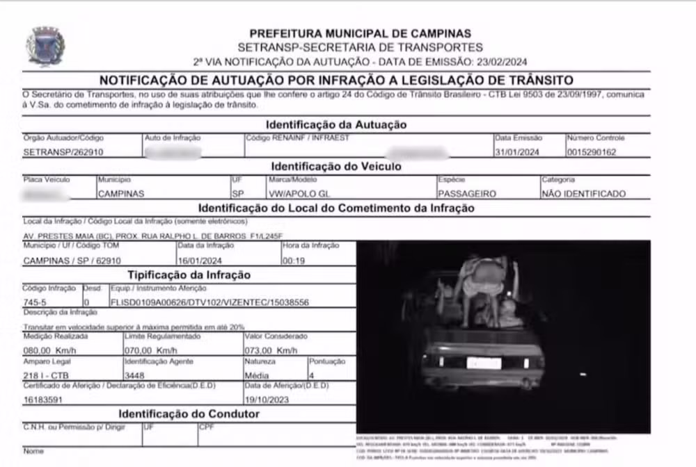 Em nota, a Empresa Municipal de Desenvolvimento de Campinas (Emdec), responsável pelo trânsito na metrópole, destacou que “o veículo foi apreendido com histórico de sete infrações cometidas entre maio de 2020 e janeiro de 2024, que somaram mais de R$ 1,3 mil em multas”.