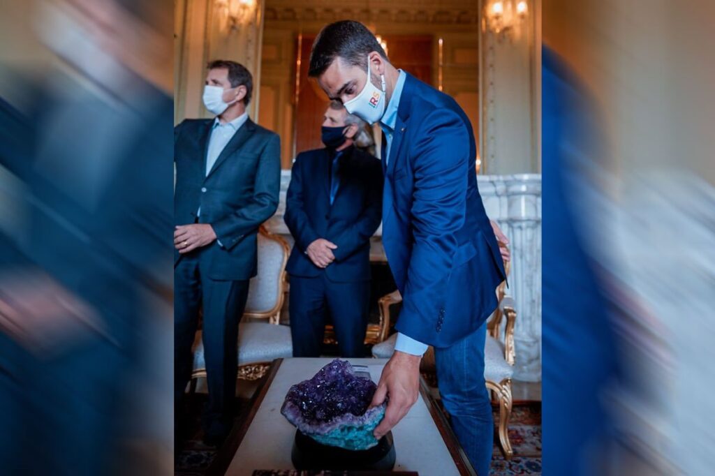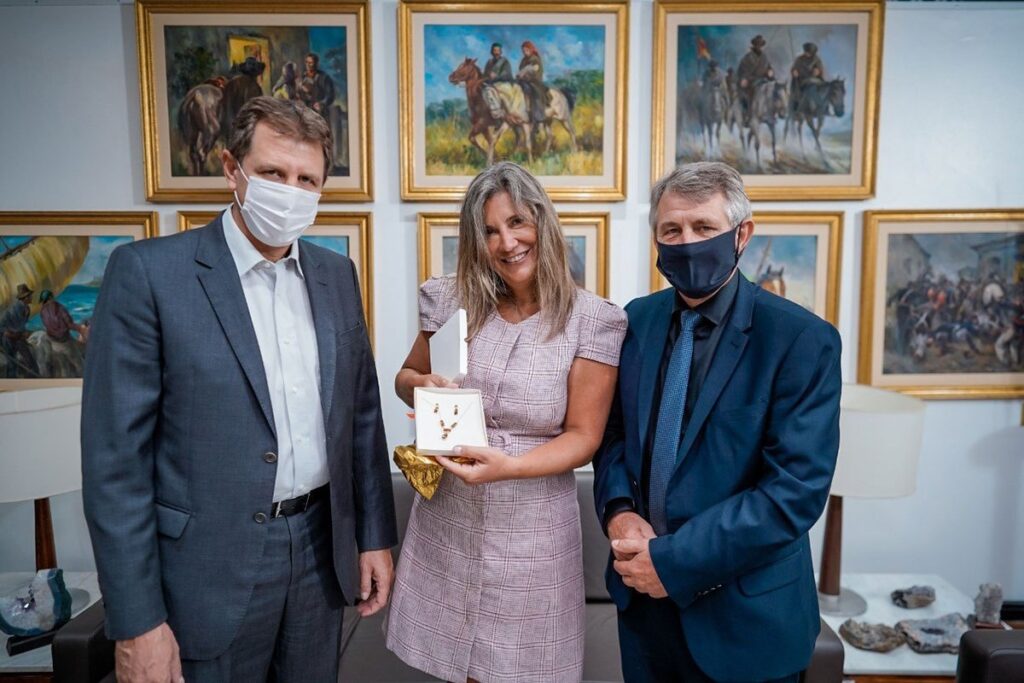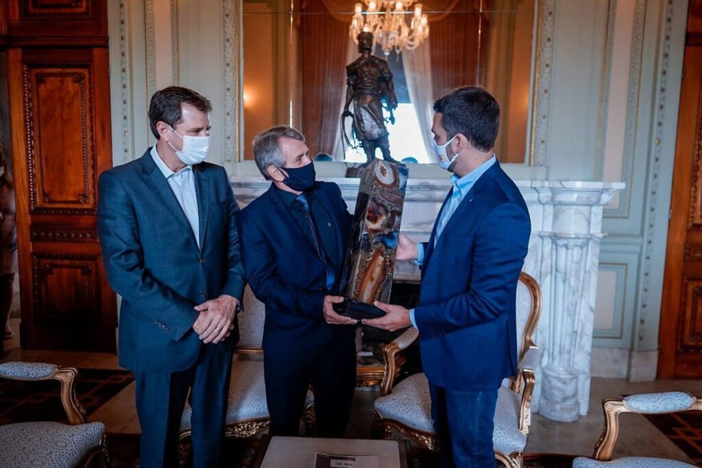 Na oportunidade, o governador Eduardo Leite também foi presenteado com uma luminária de ágata. “Estamos trabalhando para, cada vez mais, colocar em evidência o setor pedrista, valorizando as empresas do ramo. Já temos peças em locais estratégicos, como na Assembleia Legislativa, na Fiergs e na Casa do Governo do Estado no Parque Assis Brasil, em Esteio, onde acontece a Expointer”, assinala Gilberto Bortoluzzi, presidente do Sindipedras.