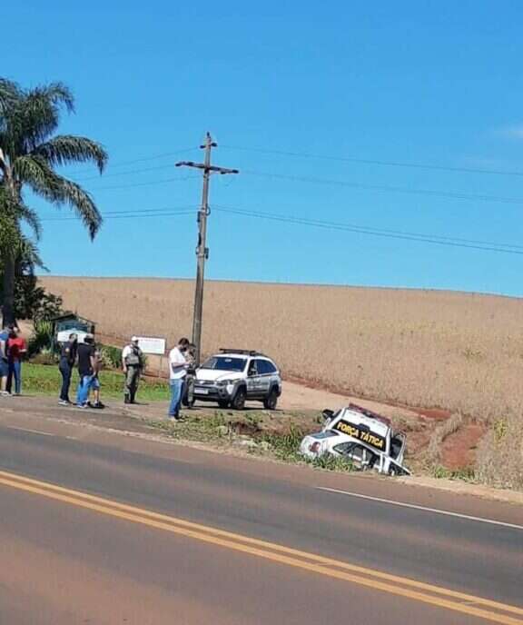 Foi deslocado ao local e tentado efetuar a abordagem do veículo VW/GOL, cor branca, que fugiu do local em alta velocidade pela RS-569, as guarnições fizeram o acompanhamento e em dado momento no KM1, o veículo e viatura se perderam, vindo os dois carros a se acidentar.