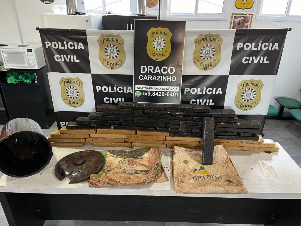 Após escavações minuciosas, os policiais descobriram dois esconderijos distintos, a cerca de 10 metros de distância um do outro. No total, foram encontrados 45 tijolos de maconha, que juntos pesavam aproximadamente 39 kg. Os entorpecentes estavam acondicionados em um balde e em dois sacos, aparentando terem sido escondidos ali há pouco tempo.