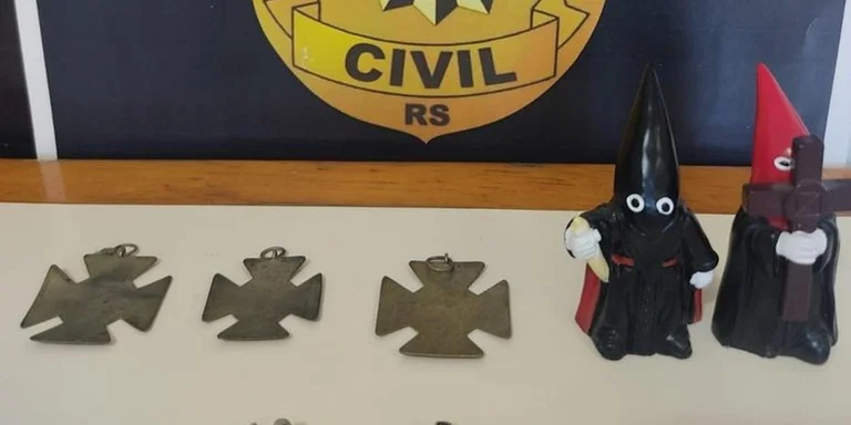 As apreensões somam pingentes com suásticas e bonecos da Ku Klux Klan. Também havia ali uma máscara de gás e um capacete militar, que são materiais similares aos utilizados na Segunda Guerra Mundial.