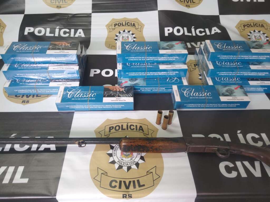A primeira prisão deu-se no cumprimento a mandado de busca e apreensão na residência de P.S.R, 51 anos. No local foi apreendido uma espingarda calibre 20, 03 cartuchos do mesmo calibre deflagrados, além de 20 maços de cigarros fabricados no Paraguai.
