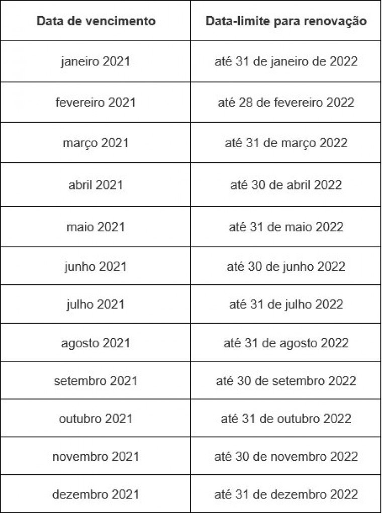 Para fins de fiscalização, consideram-se válidas as habilitações vencidas desde 1º de março de 2020 e com vencimento até 31 de dezembro de 2021, até a nova data correspondente para renovação definida nas tabelas. Isso se aplica às informações contidas na CNH, inclusive aos certificados de cursos especializados que não constam na CNH, e às Permissões para Dirigir.