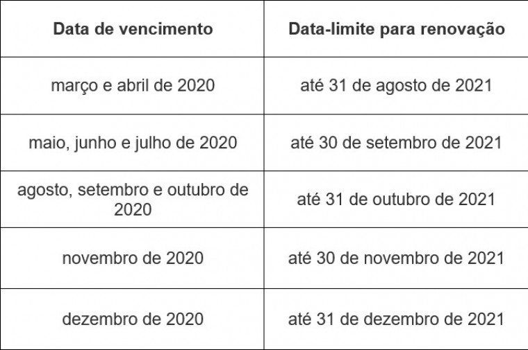 Para fins de fiscalização, consideram-se válidas as habilitações vencidas desde 1º de março de 2020 e com vencimento até 31 de dezembro de 2021, até a nova data correspondente para renovação definida nas tabelas. Isso se aplica às informações contidas na CNH, inclusive aos certificados de cursos especializados que não constam na CNH, e às Permissões para Dirigir.