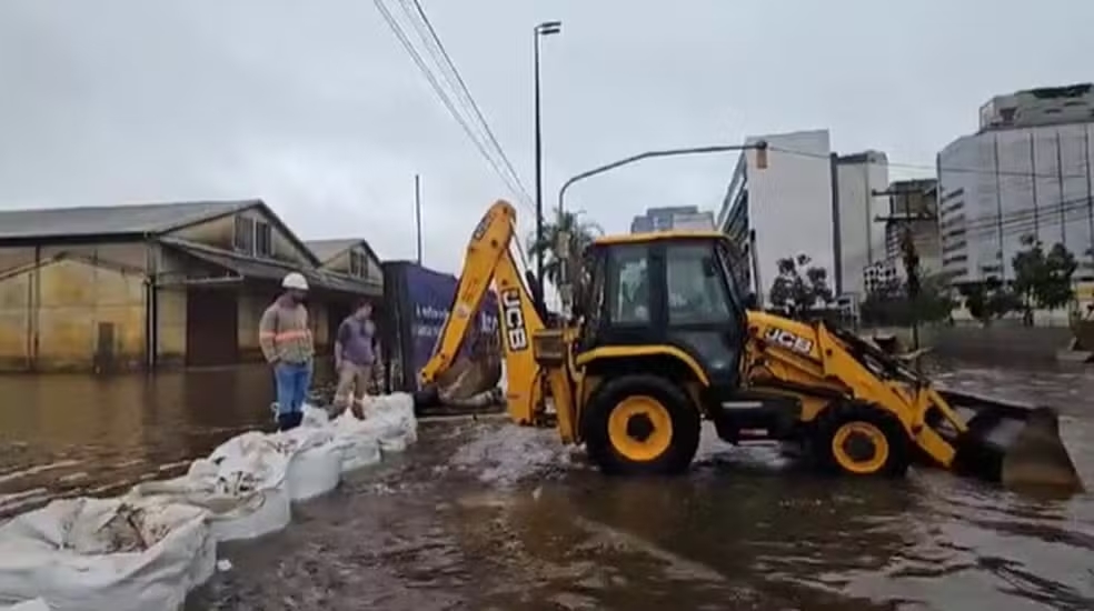 Prefeitura usa sacos de areia e cimento para fechar comporta do sistema anticheias em Porto Alegre