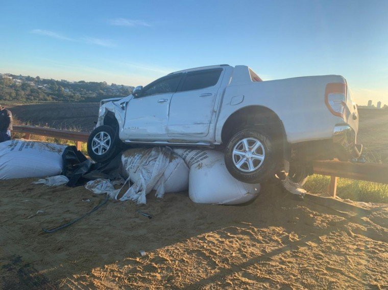 Por volta das 16h40, foi registrada uma colisão envolvendo uma caminhonete Ranger, com placas padrão Mercosul e uma carreta carregada com bags com farinha de carne de aves, de Itajaí/SC.
