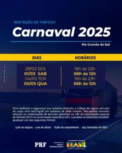 A Polícia Rodoviária Federal (PRF) inicia, nesta sexta-feira (28), a Operação Carnaval 2025, intensificando a fiscalização e as ações educativas nas rodovias federais do Rio Grande do Sul. A ação, que segue até a quarta-feira (5), faz parte do Programa Rodovida e tem como principal objetivo reduzir acidentes e salvar vidas durante um dos períodos de maior fluxo de veículos do ano. No carnaval de 2024, a PRF registrou 95 sinistros de trânsito, com 15 feridos e 4 mortes no estado.