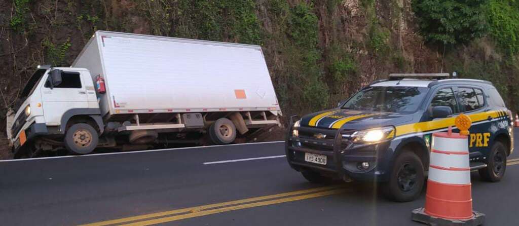 Os Policiais Rodoviários Federais foram chamados e deslocaram para atender um acidente na BR-386. No local encontraram um caminhão caído em uma sarjeta às margens da rodovia.