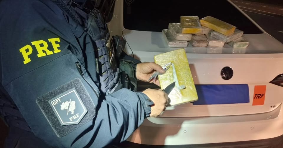 Na vistoria ao veículo, os policiais encontraram 10 tabletes de entorpecentes escondidos no estofamento dos bancos dianteiros, totalizando 5,18 kg de cocaína e 5,32 kg de crack.