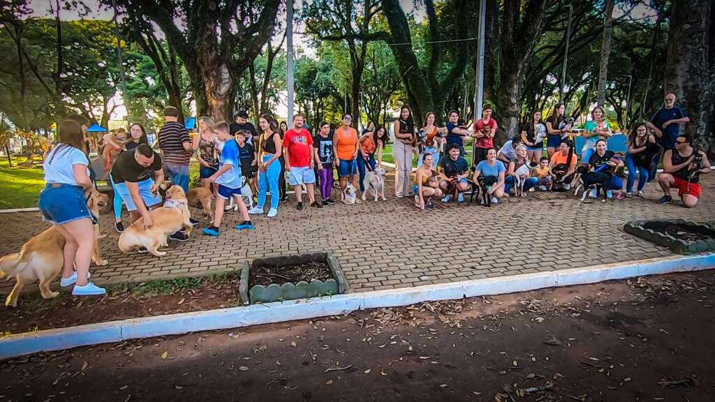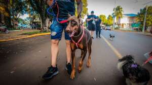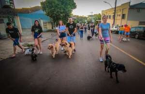 Ao todo, mais de 80 animais participando dessa primeira edição da caminhada, que percorreu as avenidas Ângelo Macalós, Duque de Caxias e Padres Réus.