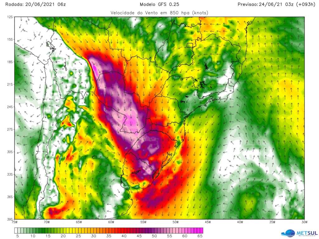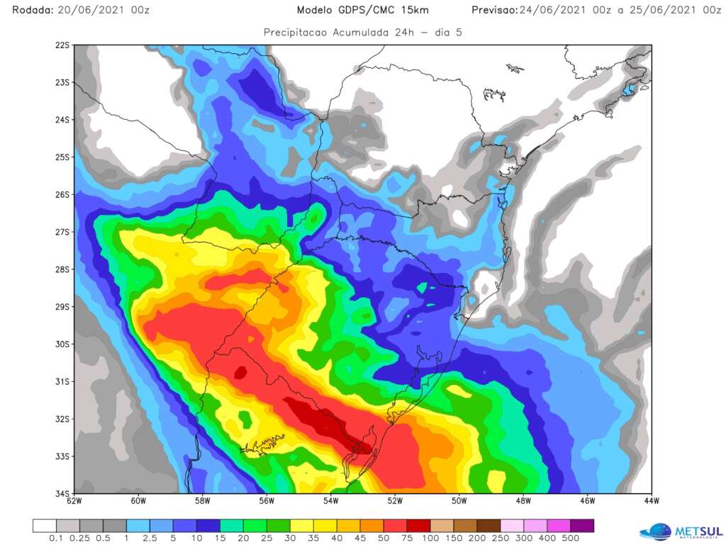 Por outro lado, na quinta-feira (24) uma forte corrente de vento do quadrante Noroeste a 1500 metros do solo, o que chamamos de jato de baixos níveis, irá transportar ar mais aquecido em direção ao Estado. Sob o mesmo ponto de vista tal vento mais quente irá propiciar um dia mais ameno com marcas de temperatura que há dias não eram registradas no Rio Grande do Sul. Em contrapartida, isso representa risco na medida em que antecipa o avanço de uma nova frente fria e eleva o risco para temporais. Alerta-se para o risco de chuva forte e tempestades com vendavais localizados e raios ao longo do dia, sobretudo na Metade Sul e Oeste. Pulsos de chuva forte a torrencial poderão ocorrer gerando altos volumes de chuva em poucas horas.  Em princípio, os maiores acumulados de precipitação neste evento de instabilidade irão se concentrar na Metade Sul do Estado com projeção de 50 a 75 mm. Entre o Norte e o Leste o sol aparece e a temperatura sobe a tarde antes do avanço da instabilidade de forma isolada.