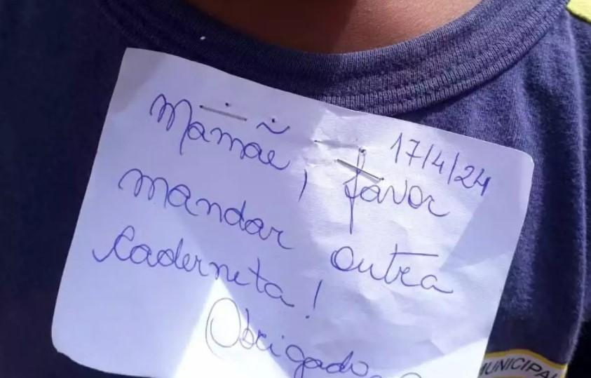 “Mãe, por favor, envie outra caderneta! Obrigada”, dizia a nota, que causou indignação na mãe. “É revoltante! Quando deixamos nossos filhos na escola, esperamos que sejam bem tratados e cuidados. Ele tem apenas 5 anos!”, disse ao G1.