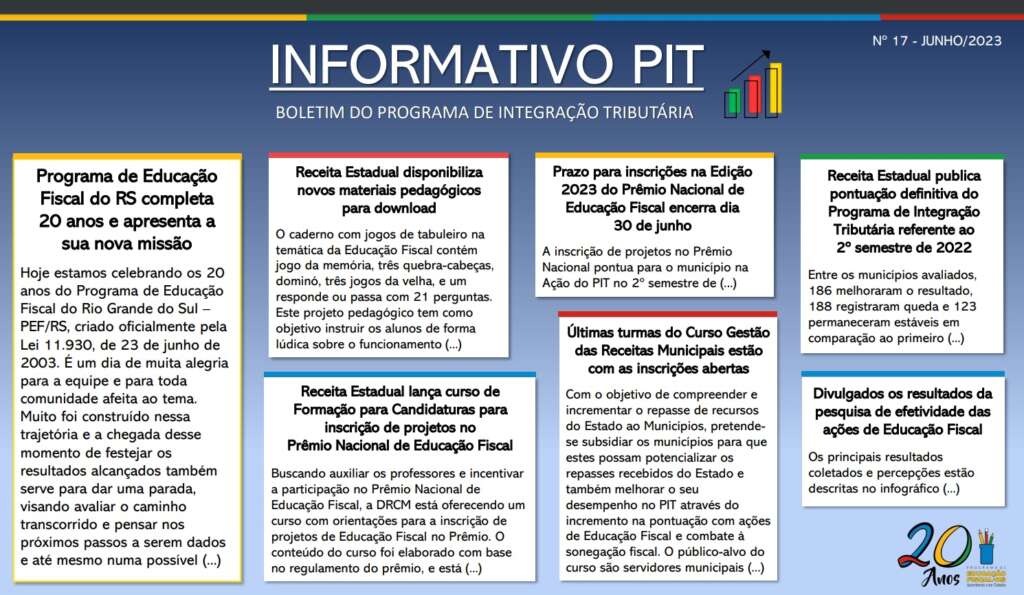 Com o novo selo comemorativo e o novo layout do Boletim Informativo PIT, o Programa de Educação Fiscal do Rio Grande do Sul segue fortalecido em sua missão de formar cidadãos conscientes e engajados na construção de uma sociedade mais justa e transparente.