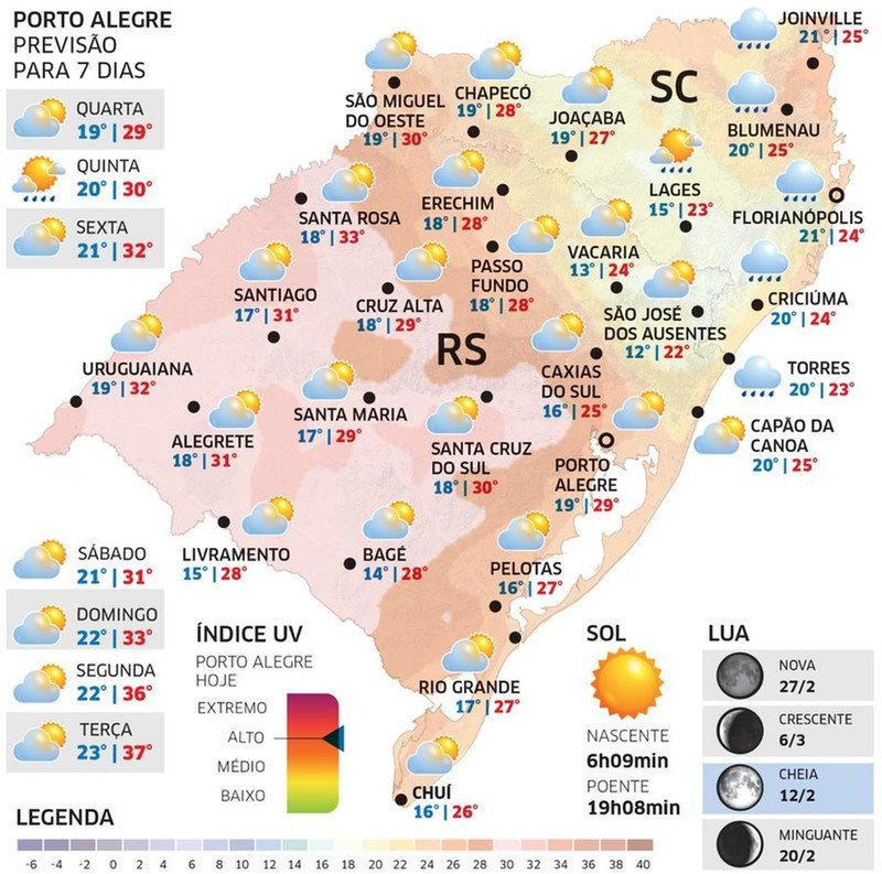 Uma frente semi-estacionária sobre o Sul do Brasil traz mais nuvens e chance de chuva para pontos do Médio e Alto Uruguai, Planalto Médio, Serra, Aparados e Litoral Norte. Na Grande Porto Alegre, se ocorrer instabilidade, será muito isolada e passageira.