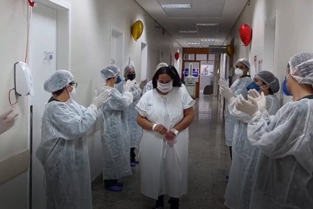 Os aplausos dos profissionais de saúde anunciam a vitória contra a covid-19. “Quero agradecer a todos pelo carinho que tiveram comigo, esse carinho é muito importante para a gente que está longe da família e faz muito bem pra gente, vocês são nota dez”.