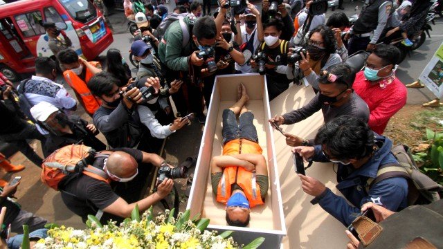 “Com a Covid-19, existe o risco de (os infratores) serem colocados dentro de um caixão de verdade”, afirmou Budhy Novian, diretor da Agência de Ordem Pública de Jacarta Oriental, acrescentando que a punição nova deve durar mais alguns dias.
