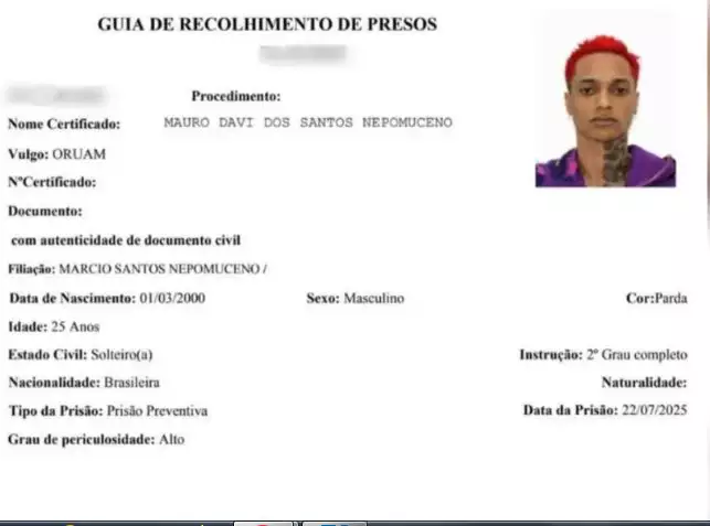 O rapper Mauro Davi dos Santos Nepomuceno, conhecido como Oruam, de 25 anos, foi classificado como preso de “alta periculosidade” – o terceiro nível mais elevado em uma escala de quatro graus adotada pelo sistema prisional do Estado do Rio de Janeiro.