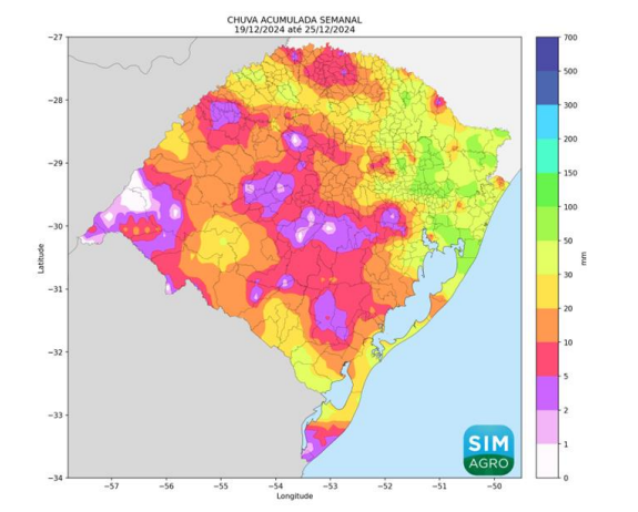 Os prognósticos para os próximos sete dias indicam chuvas irregulares por todo o estado, com acumulados de baixos volumes ocorrendo principalmente em áreas do oeste, noroeste e centro do território gaúcho. Estes volumes podem chegar até os 10 mm de chuva acumulada na semana.