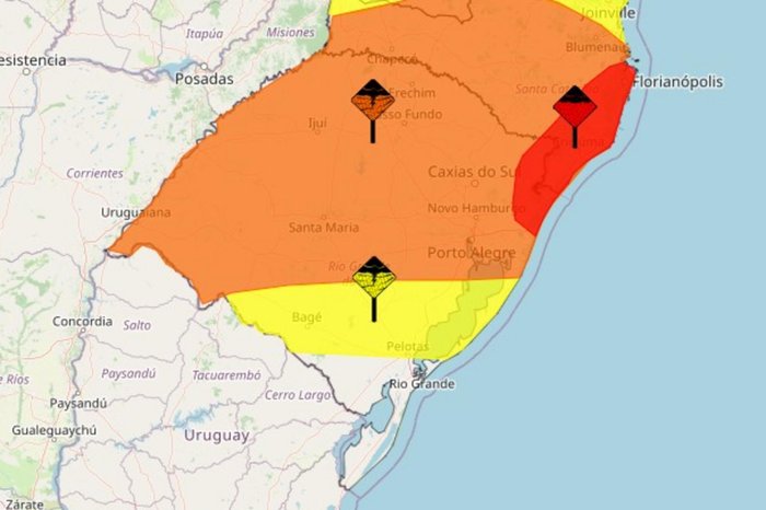 O primeiro aviso é valido das 18h desta terça até o meio-dia de quarta. O alerta vermelho representa grande perigo para acúmulo de chuva em áreas do Litoral Norte e Serra. Os volumes podem chegar a cem milímetros, e há risco para alagamentos. A cidade de Torres, no Litoral Norte, deve registrar 70 mm na quarta, o que representa 48% da média história para o período.