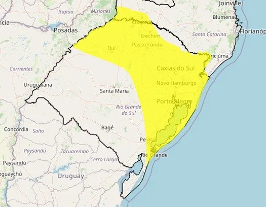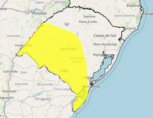 O primeiro alerta, de nível amarelo, está vigente desde às 9h40min e é válido até às 23h59min desta terça. Ele abrange municípios da Fronteira OesteCampanha, Região Central e Sul. Nessas áreas, a previsão é de chuvas de até 50 milímetros e rajadas de vento que podem alcançar 60 km/h.
