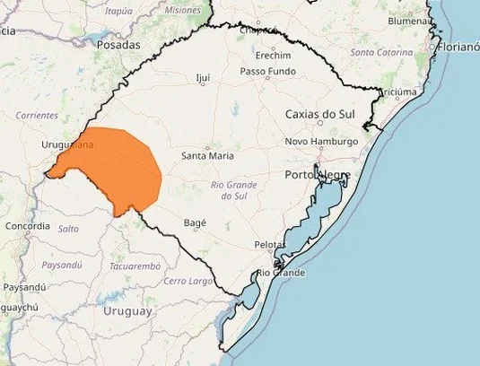 Um segundo aviso, de nível laranja, foi emitido às 9h51min desta terça e se estende até o meio-dia de quinta-feira (28). Ele atinge a Fronteira Oeste, com possibilidade de volumes de chuva significativos, além de risco para alagamentos.