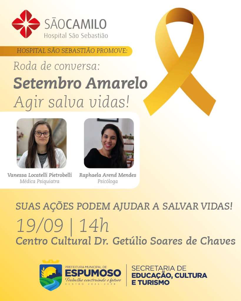 Esse é um assunto sensível, que diz respeito a todos. Por isso, o Hospital São Sebastião está promovendo uma roda de conversa sobre o Setembro Amarelo, destinado aos professores do município de Espumoso. Será um momento formativo, com o principal objetivo de instrumentalizar os educadores frente a este tema que ainda é um tabu.