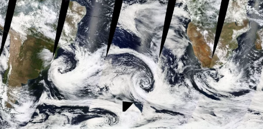No último sábado, satélites meteorológicos da NASA capturaram um impressionante fenômeno natural: um verdadeiro desfile de ciclones movendo-se entre o Brasil, na América do Sul, e a África. Três desses sistemas podiam ser observados em latitudes médias, enquanto um quarto se encontrava mais ao Sul, próximo à Antártida. Esse conjunto de baixas pressões meteorológicas, termo comumente utilizado no jargão meteorológico, teve impacto no tempo no Atlântico Sul e áreas adjacentes.