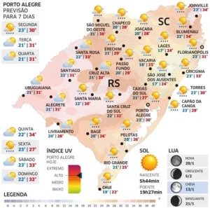 Chove na maioria das regiões ao menos em parte do dia. A chuva será irregular e em muitos locais chove pouco (em pontos da Metade Oeste pode não cair uma gota). A instabilidade atua mais no Sul, no Leste e no Norte do Estado. No Sul e no entorno da Lagoa dos Patos, há maior risco de chuva forte com altos volumes em algumas localidades, não se afastando a possibilidade de temporais. O vento sopra com rajadas no Sul gaúcho.