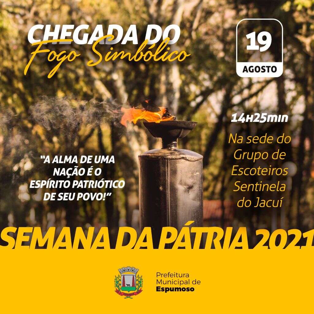 A Secretaria de Educação Cultura e Turismo, através do Departamento de Cultura convida a comunidade espumosense para a cerimônia de recepção do Fogo Simbólico da Pátria. A chama será entregue pela Liga da Defesa Nacional (LDN), nos municípios gaúchos entre 15 e 20 de agosto.