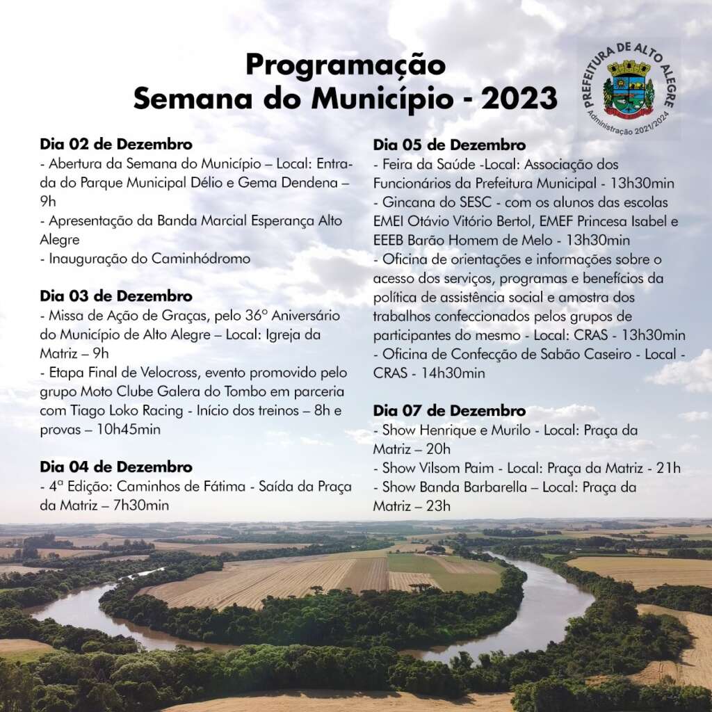 “O portfólio de programação é extenso e de qualidade, pois haverá muitas atividades sendo desenvolvidas, dentre elas a Feira da Saúde, Oficinas, Gincana do SESC, Etapa Final de Velocross e Shows no dia 07 de dezembro, gratuitos com Vilson Paim e Banda Barbarela. Todos estão convidados a fazer parte desta celebração!”, destaca Diana.