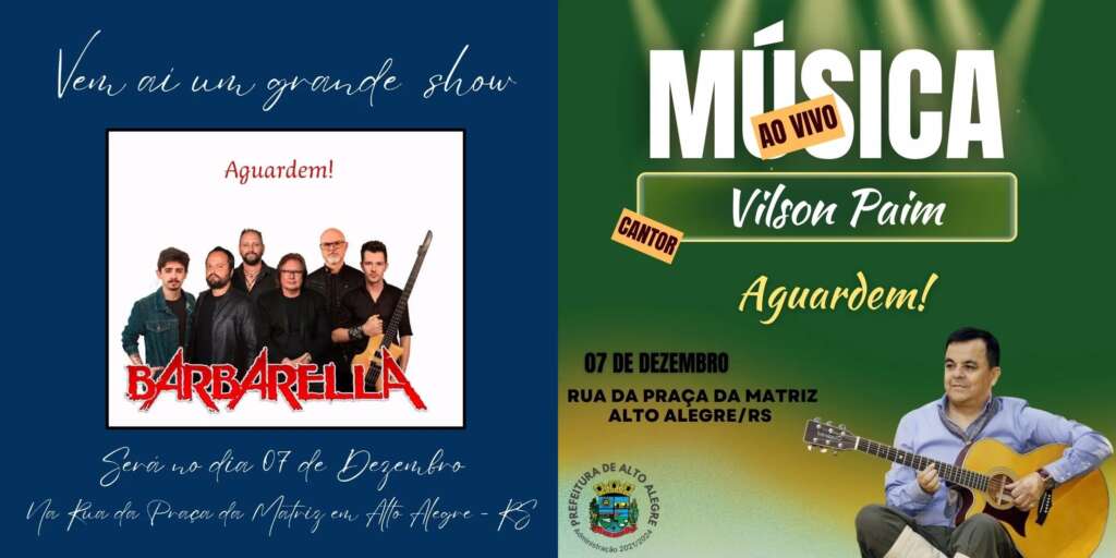 A Prefeitura de Alto Alegre anunciou os shows que vão agitar a Semana de Aniversário do município, que acontecerá de 02 a 09 de dezembro. Dois nomes de peso marcarão presença no evento: Vilson Paim e Barbarela, que se apresentarão no dia 07 de dezembro. Os espetáculos terão como palco a Rua da Praça da Matriz e toda a comunidade está convidada a prestigiar.