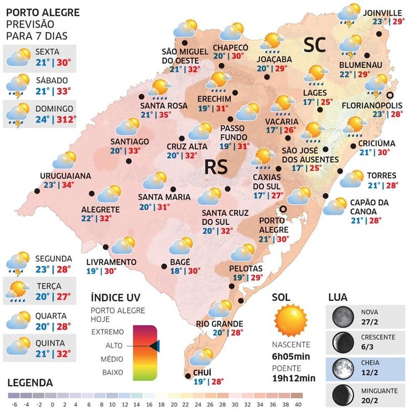 O dia vai começar com marcas agradáveis na maioria das localidades, mas aquece rapidamente durante a manhã. A tarde terá calor, mas não intenso como no começo desta semana. As máximas serão mais elevadas no Noroeste gaúcho.