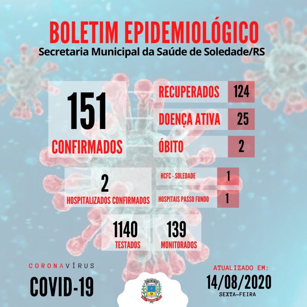 Soledade registra dois novos casos de Covid-19 nas últimas 24h, sendo pacientes do sexo masculino, com idades de 18 e 32 anos. Até o momento, são 124 pessoas recuperadas e 25 soledadenses que permanecem com a doença ativa no organismo. Confira todos os dados no card abaixo