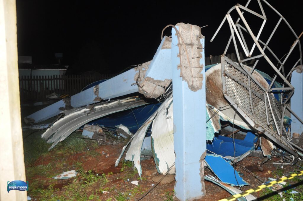 Uma caixa d’água que abastecia os Bairros Arroio, São Valentim, Parizottto e Habitar Brasil, caiu. Toda a estrutura de concreto que suportava a caixa de 50 mil litros foi entortada pela força do vento.