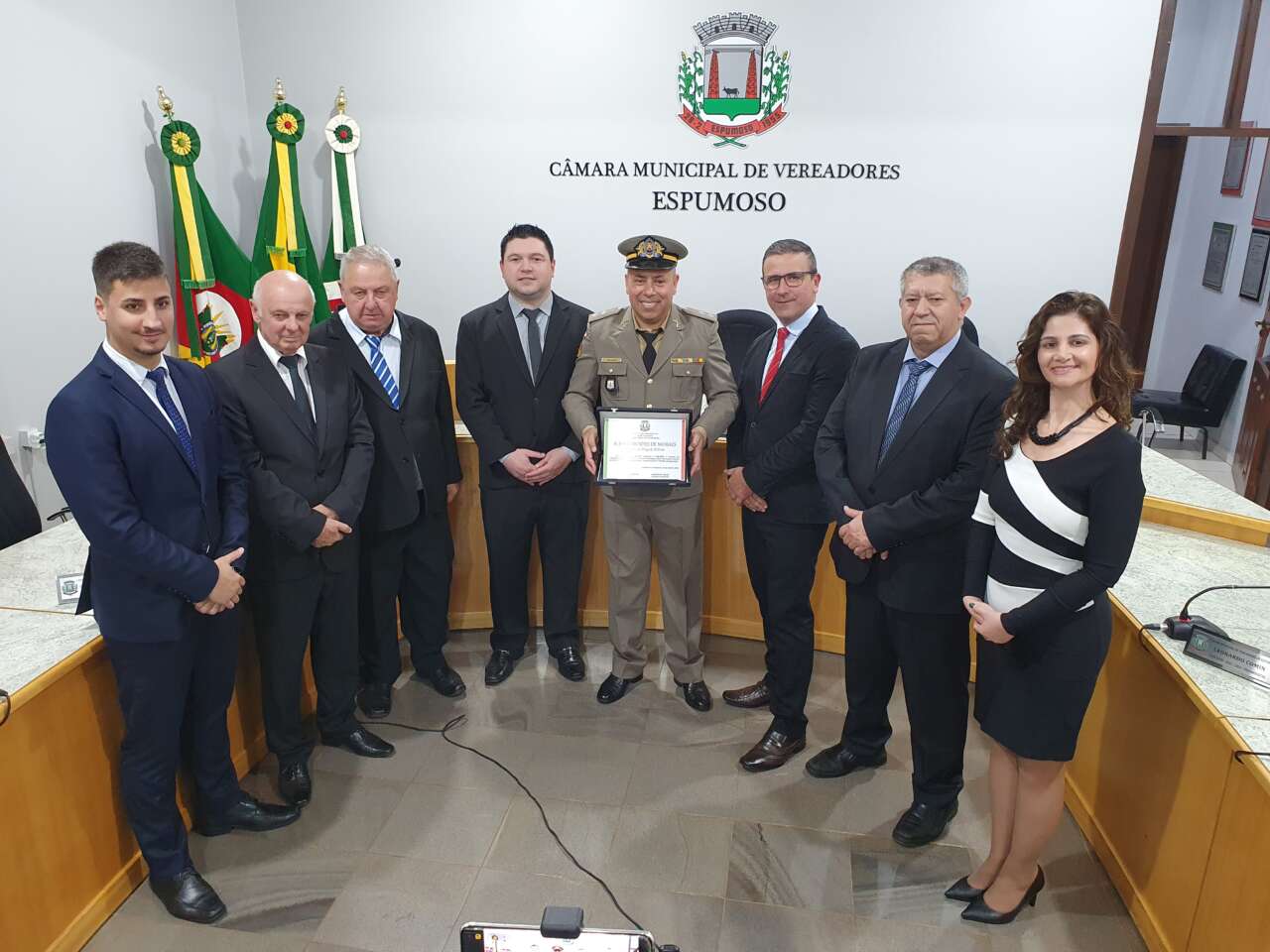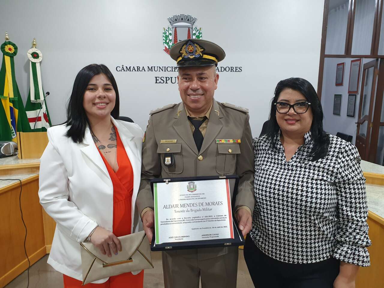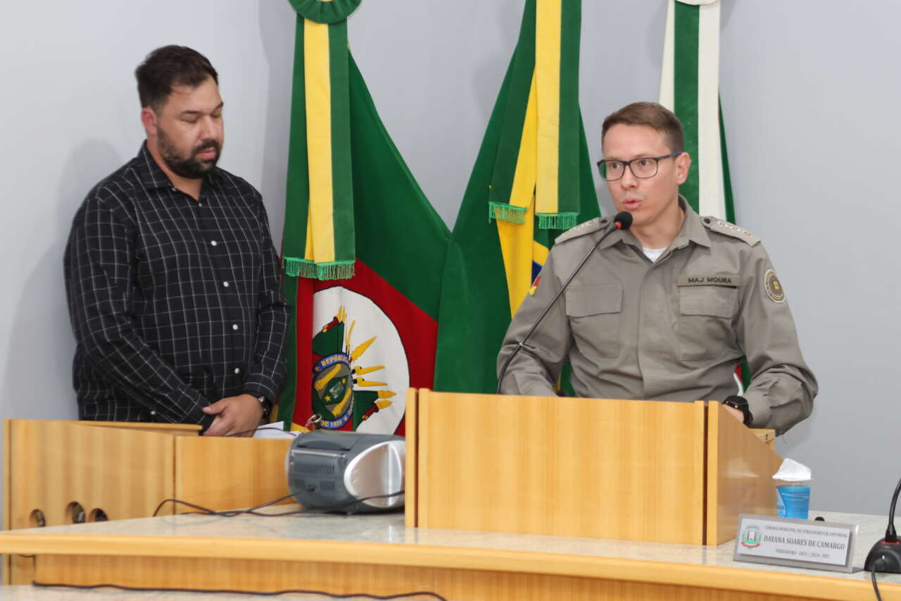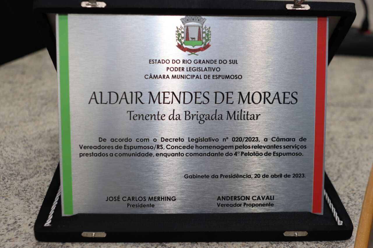 A Câmara de vereadores de Espumoso realizou em sessão solene na noite desta quinta-feira, 20, uma homenagem ao Tenente Aldair Mendes de Moraes, comandante do 4º Pelotão da Brigada Militar, com sede em Espumoso.
