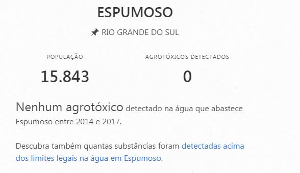 O estudo feito em Espumoso não apresentou a presença de nenhum tipo de agrotóxico presente na água que abastece a cidade. De acordo com os dados, a água ingerida pelos espumosense ainda não sofreu nenhum tipo de contaminação pelos agrotóxicos. Porém, Espumoso e Tapera são os únicos dois municípios da região que tem índice 0 de infecção. Dentre os municípios que aparecem na lista, estão Alto Alegre com 14 agrotóxicos encontrados na água, Campos Borges com 7, Soledade com 14 , Fontoura Xavier com 13 sendo 5 deles considerados perigosos, ainda que nenhum acima dos limites estipulados pela legislação, e que são associados a doenças crônicas como câncer, defeitos congênitos e distúrbios endócrinos.
