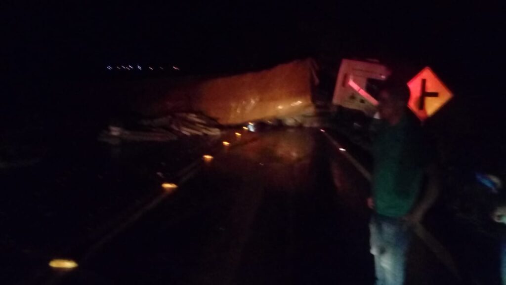 Uma carreta tombou na noite desta segunda-feira (18) e ficou sobre o asfalto, na ERS-223, na comunidade de Arroio Grande em Selbach.