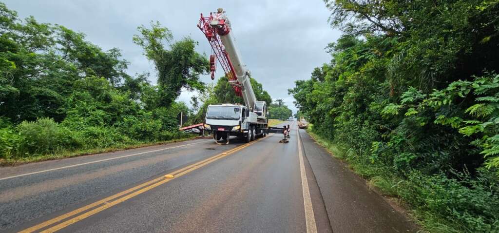 A interrupção se dá para que os veículos envolvidos na saída de pista registrada na madrugada de hoje, quando um caminhão plataforma carregado com outro caminhão e um trator saiu da pista.