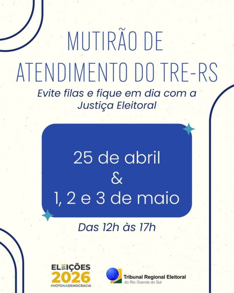 O Tribunal Regional Eleitoral do Rio Grande do Sul promove mutirão, com atividades sábado, 25 de abril, e também nos dias 1º, 2 e 3 de maio, no fim de semana anterior ao fechamento do cadastro eleitoral, marcado para 6 de maio.