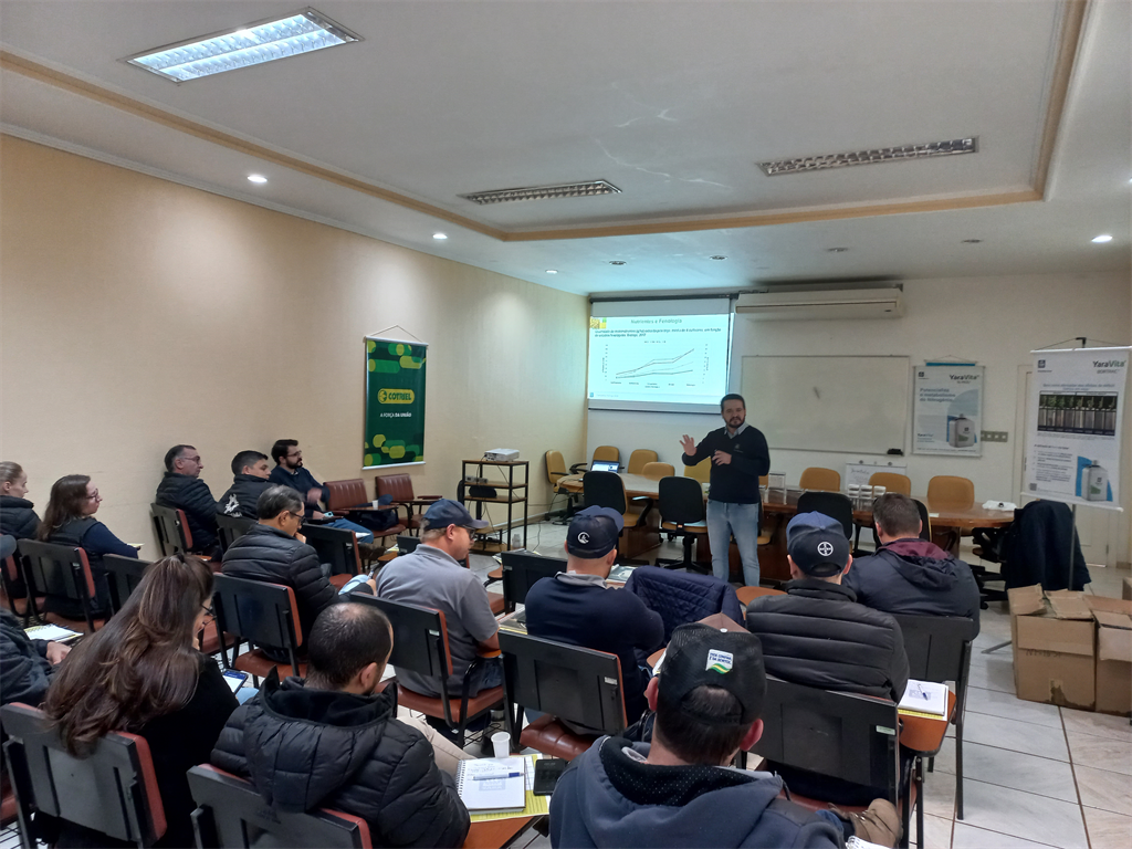Rodrigues ressaltou que os treinamentos promovidos pela Yara não se limitam apenas à fórmula dos produtos, mas também abordam a tecnologia dos fertilizantes e questões relacionadas à fitossanidade. O consultor alertou os associados da Cotriel sobre a importância de estarem atentos aos aspectos técnicos dos produtos que adquirem, bem como às doenças causadas pelo clima úmido. Ele enfatizou que dois momentos fundamentais no estabelecimento da cultura de inverno são a aplicação oportuna de nitrogênio para definir o potencial produtivo do trigo e o manejo de aplicações foliares com produtos à base de zinco e manganês, visando ao estabelecimento, desenvolvimento e manutenção da sanidade das culturas.