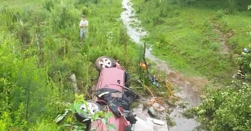 O motorista do veículo com placas de São Leopoldo acabou perdendo o controle e caiu às margens da rodovia ERS-332.