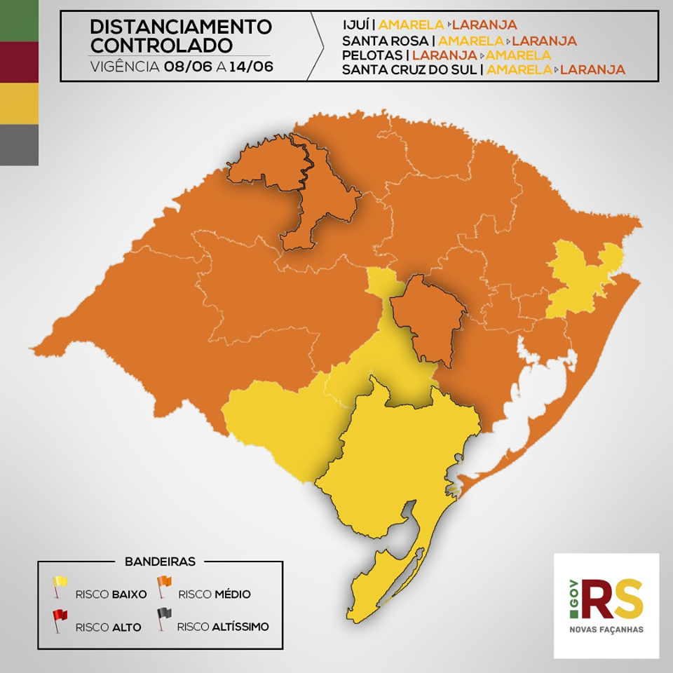 Na atualização do sistema das regras de distanciamento controlado no Rio Grande do Sul, neste sábado (6), três regiões que estavam com bandeira amarela (risco baixo) passaram para laranja (risco médio): Ijuí, Santa Rosa e Santa Cruz do Sul. Nesta rodada, apenas a região de Pelotas apresentou melhora, reduzindo o grau de laranja para amarelo no combate à pandemia de coronavírus.