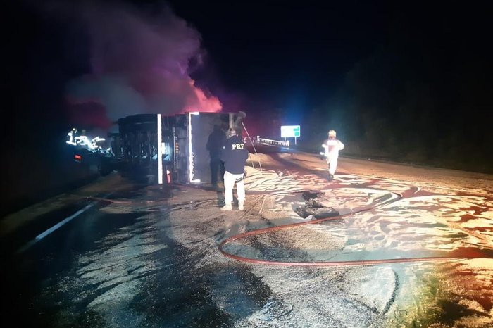 A Polícia Rodoviária Federal (PRF) e os bombeiros atendem a ocorrência. A rodovia chegou a ser totalmente bloqueada, nos dois sentidos, mas foi liberada de forma alternada pouco antes das 8h.