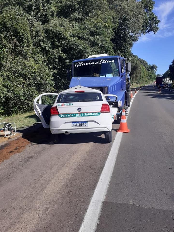 Segundo a Corporação de Bombeiros, a colisão envolveu um caminhão de Ijuí e um Gol placa Mercosul. O acidente aconteceu no km 282.