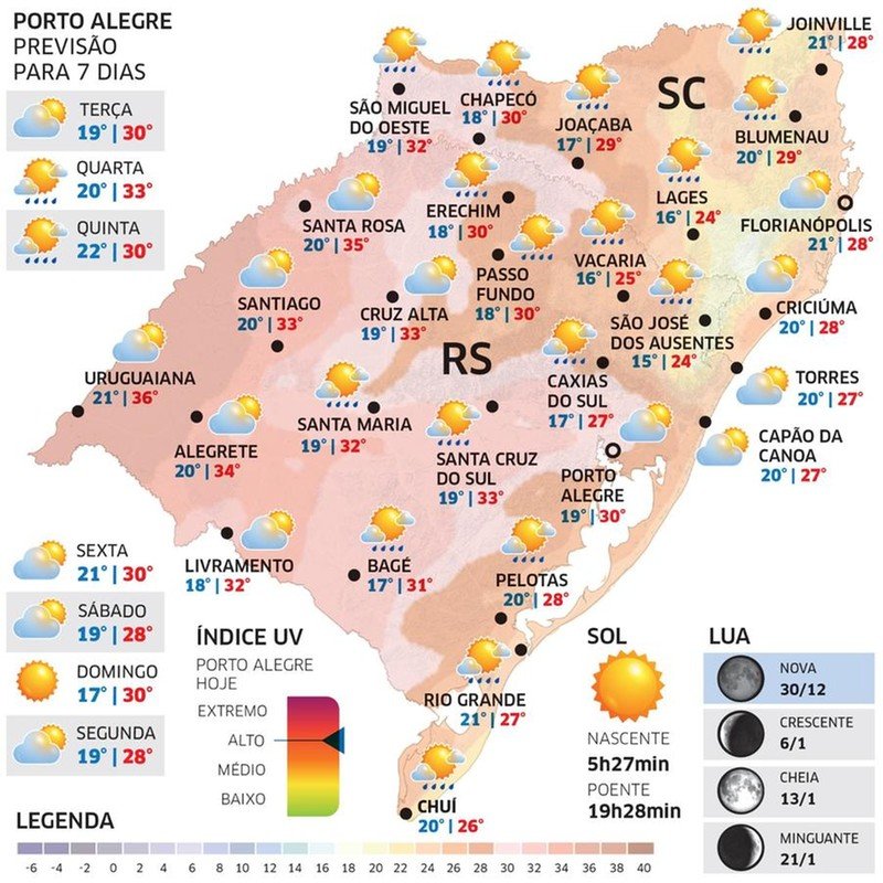O ano de 2024 vai se despedir com um dia de sol e muito calor em todo o Rio Grande do Sul. O último dia do trágico ano das enchentes terá tempo firme na maioria das localidades, mas o aquecimento deve formar nuvens com chuva isolada entre a tarde e o começo da noite em pontos do Centro para o Norte do território gaúcho.