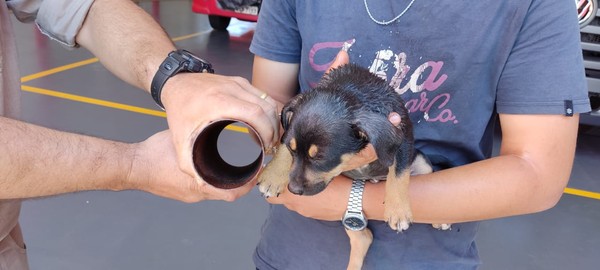 De acordo com o Corpo de Bombeiros, o dono do filhote foi até o quartel com o animal preso ao cano. Ele contou aos socorristas que a família tentou tirar o tubo da cabeça do cachorro, mas sem sucesso.