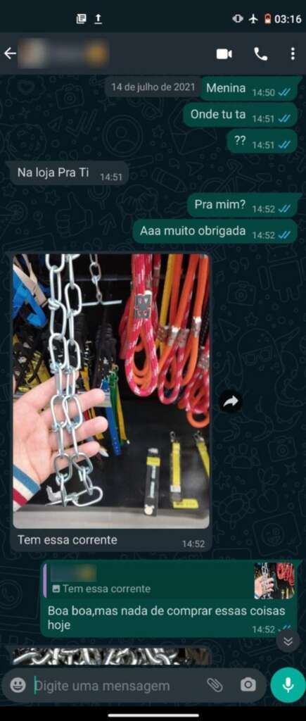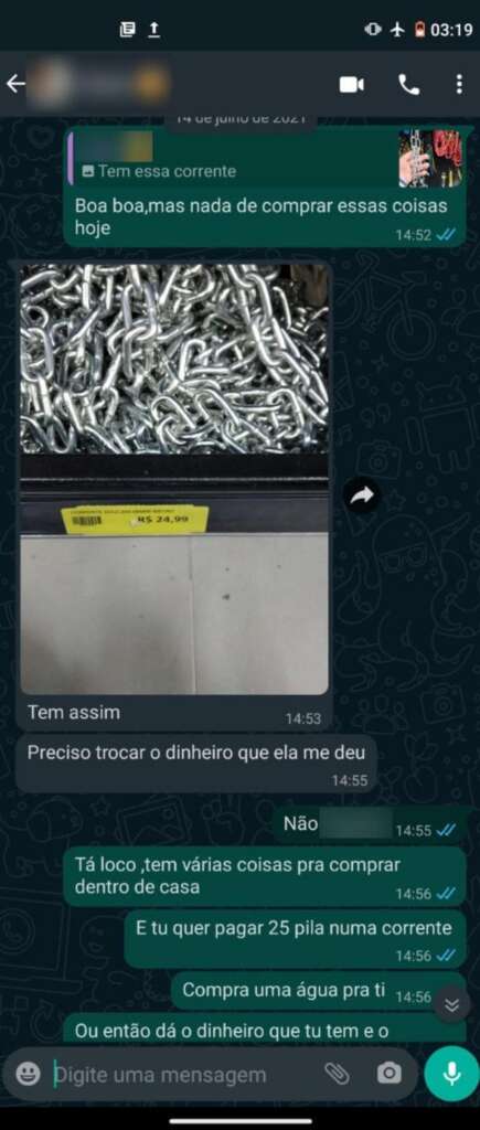 Em uma das trocas de mensagens divulgadas, a companheira e a mãe da criança falam sobre a compra de uma corrente e um cadeado que, conforme a Polícia Civil, foi usado para acorrentar o garoto.
