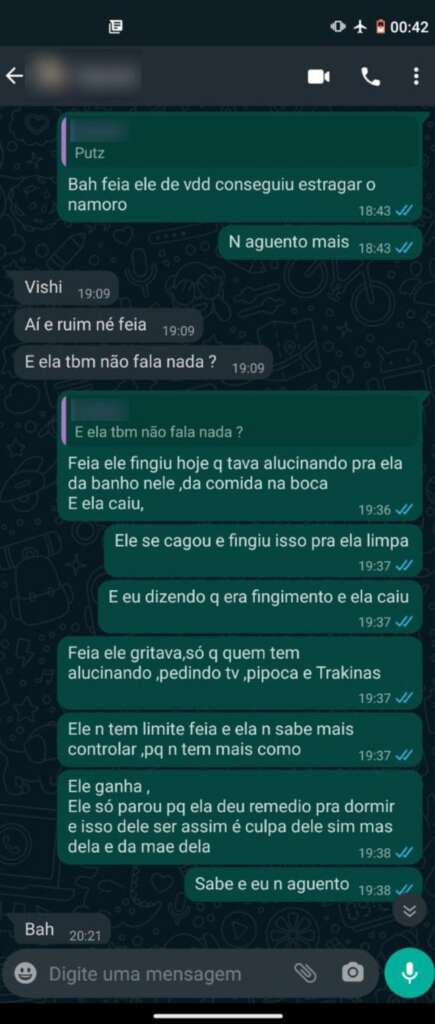 Outra conversa divulgada envolve a companheira da mãe do menino com a irmã. Ela reclama que a criança estaria “estragando o namoro” e relata as ações do garoto para chamar a atenção da mãe.